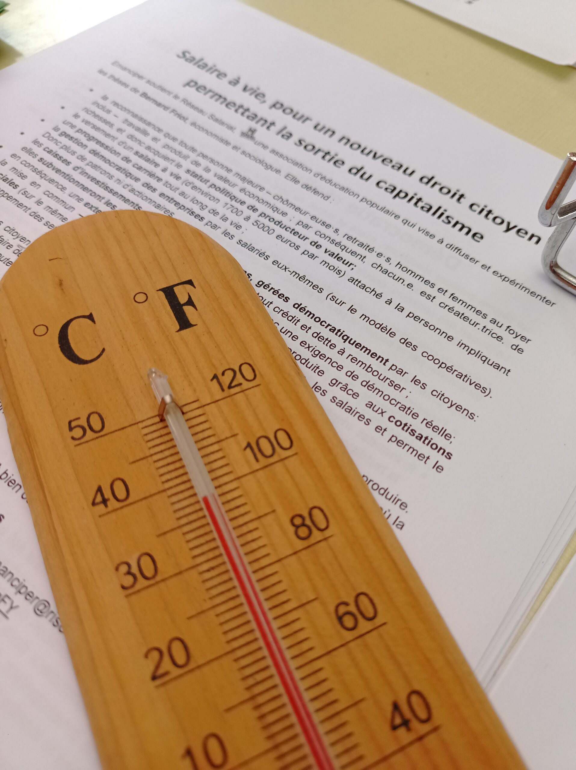 - Dimanche matin, nous avons eu le plaisir de recevoir 3 copains/copines du Réseau Salariat de Grenoble, qui nous ont présenté l’expérimentation qui se prépare activement pour mettre en place une sécurité sociale de l’alimentation (SSA) à Grenoble. Le modèle qu’ils proposent est aux antipodes de l’aide alimentaire et insiste sur la reprise en main par les habitants de la production et de la distribution d’aliments sains et locaux, en en subventionnant une partie via un conventionnement sous conditions – les critères seront discutés par les habitants eux-mêmes. Il y a bien entendu un volet d’accès à l’alimentation pour tous (et non seulement pour les pauvres), pour en finir avec la précarité alimentaire. Ce modèle serait déployé en partenariat avec la ville de Grenoble. Contactez-nous si vous voulez en savoir plus, Emanciper a également un groupe sur la SSA.